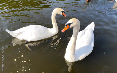 © chekart, Fototapeta premium Two beautiful white swans swim in the pond