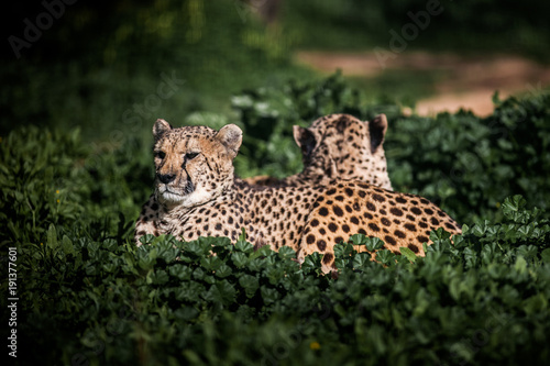 © Artframe , Fototapeta premium Two Beautiful Wild Cheetahs resting on green fields, Close up