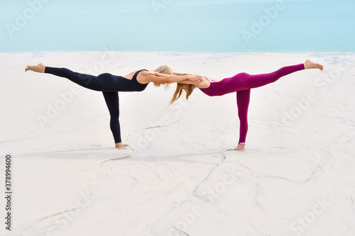 © sonsedskaya, Fototapeta premium Two beautiful young women perform pose yoga virabhadrasana on the beach
