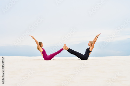 © sonsedskaya, Fototapeta premium Two beautiful young women perform yoga pose navasana