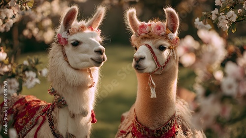 © Jojo*, Naklejka premium Two beautifully adorned llamas stand gracefully amidst a vibrant, sun-drenched garden, their elegant decorations adding to the enchanting scene.