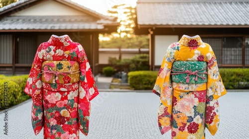 © NEXT-Ai, Fototapeta premium Two beautifully patterned kimonos in red and yellow, displayed outdoors against a serene Japanese backdrop during sunset.