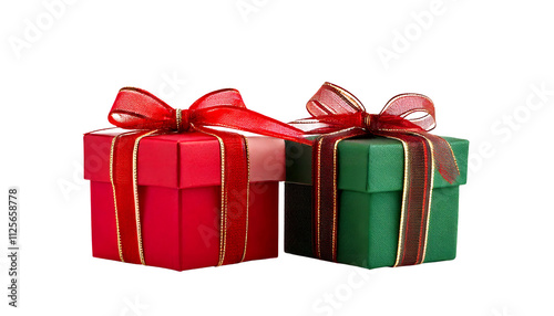Obraz premium Two Beautifully Wrapped Christmas Presents Red and Green Gift Boxes with Bows