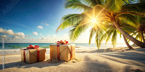 © Roman, Obraz premium Two beautifully wrapped presents sit on a sandy beach, surrounded by lush palm trees. The sun sets on the horizon, casting a warm glow on the scene