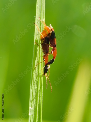 © Jakirul, Fototapeta premium Two beetles mating on a blade of green grass