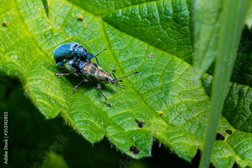 © Ronny Rose, Fototapeta premium Two beetles mating on one leaf, two bugs, Phyllobius pomaceus on a leaf, macro photo