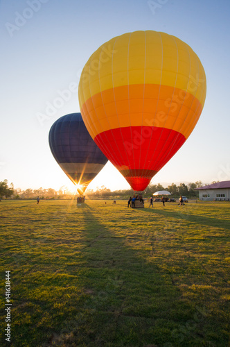 © Chakorn, Obraz premium Two big balloon ready to take off at green field