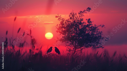 © jr-art, Obraz premium Two birds are perched on a tree in a field with a sunset in the background