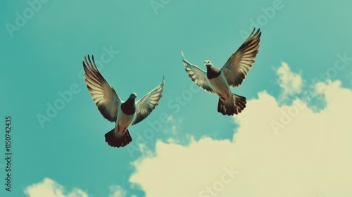 © Plaifah, Obraz premium Two Birds Flying Against Bright Blue Sky with Fluffy Clouds