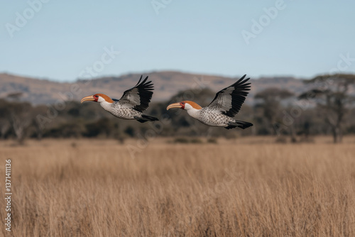 Fototapeta premium Two birds flying in the sky over a field of tall grass