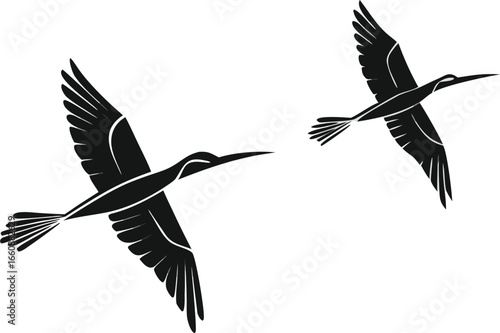 Obraz premium Two birds in flight, stylized silhouette graphic design.