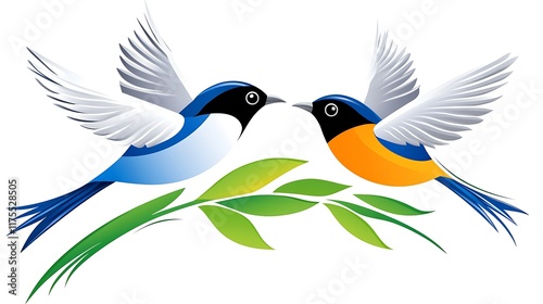 © RAKSIWAH, Naklejka premium Two Birds in Flight with Green Leaves