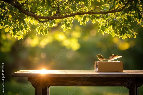 © JK_kyoto, Obraz premium Two birds perched on a box in a sunlit garden, surrounded by lush greenery, creating a serene and tranquil atmosphere.