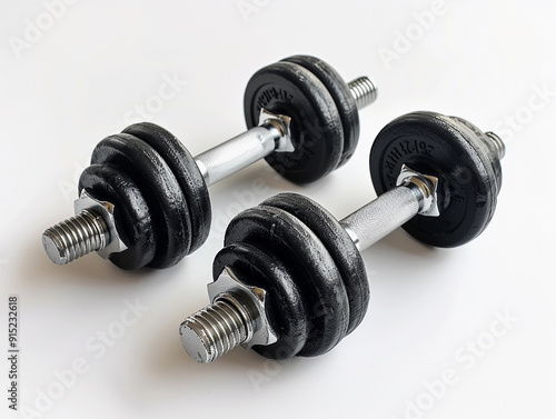 Fototapeta premium Two black adjustable dumbbells placed on a clean surface for a home workout...