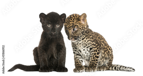 Obraz premium Two Black and Spotted Leopard cubs, 3 and 7 weeks old