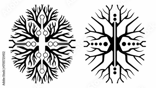 Fototapeta premium Two black and white abstract designs resembling trees connected by central circuit like structures silhouette