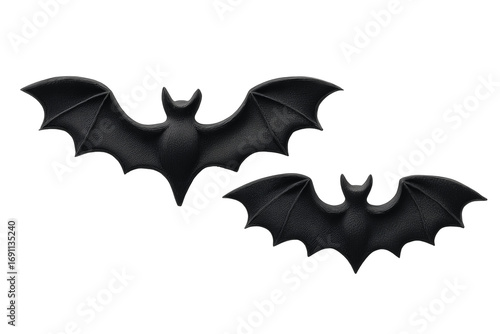 Fototapeta premium Two black bat silhouettes, paper cutouts, placed on clean white background, minimal flat lay.
