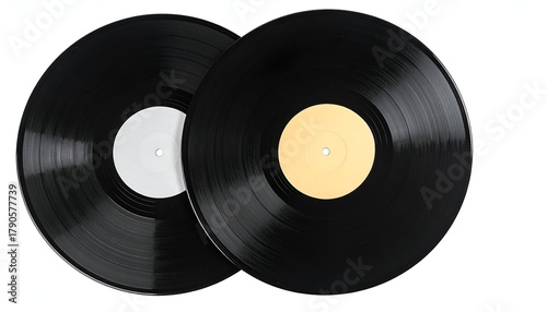 © devina, Obraz premium Two black circular discs with central labels on a white background
