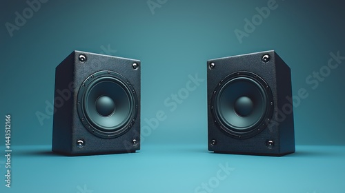 © Wiryo, Fototapeta premium Two black cube speakers on teal background.