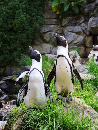 Naklejka premium Two black-footed penguins look up simultaneously. Spheniscus demersus.