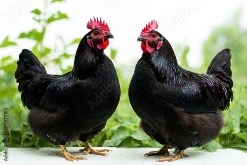 © Veronika, Fototapeta premium Two black hens standing together in a lush garden during daylight hours