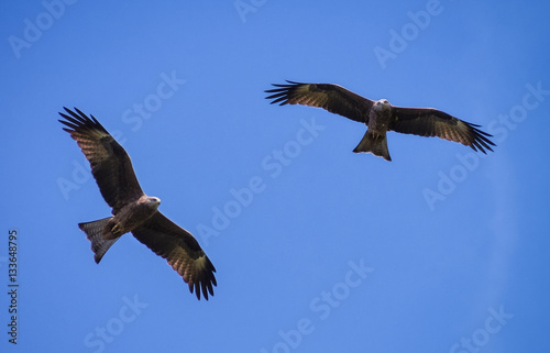 © Artcomma, Obraz premium Two black kite fly under the sunlight, eagle fly