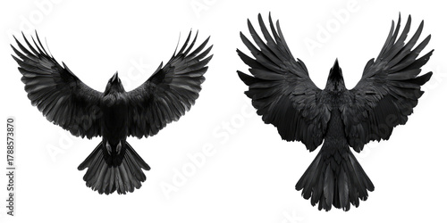 Naklejka premium Two black ravens, with outstretched wings, soaring through the sky