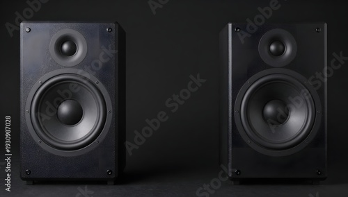 © Studicon, Fototapeta premium Two black speaker boxes stand on a black surface against a black background