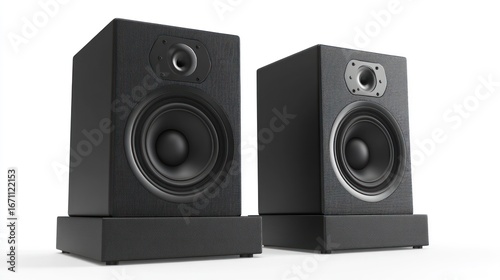 © Aliando, Fototapeta premium Two black speakers, front view, placed on matching black stands, isolated.
