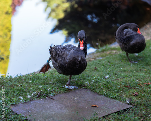 Fototapeta premium Two black swans near a pond, one standing on grass and the other resting,...