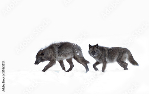 © Jim Cumming, Fototapeta premium Two Black wolves isolated on a white background walking in the winter snow in Canada