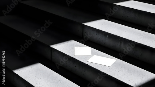 © Muhammad Faisal, Obraz premium Two blank business cards on concrete stairs with sunlight