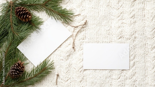 Obraz premium Two blank business cards rest on a knitted sweater adorned with pine branches...