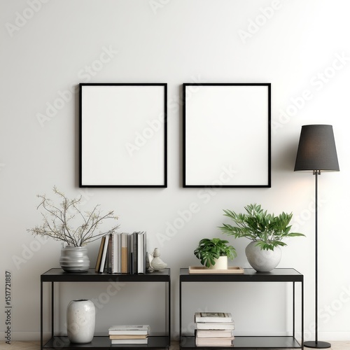 © Rewa, Obraz premium Two blank frames on a white wall, simple side tables, plants, and books