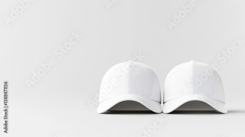 Obraz premium Two blank white baseball caps sit side-by-side against a plain white background. The image is clean and simple, high resolution, with even lighting. The style is minimalist and modern. The overall mo
