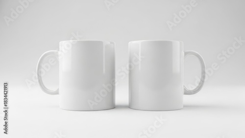 © MdAbulBasar, Fototapeta premium Two blank white ceramic mugs side by side on a white background, ready for custom design