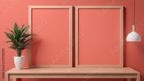 © Chonlachit, Fototapeta premium Two Blank Wooden Picture Frames Mockup on a Light Wood Table Against a Vibrant Coral Wall with a Potted Green Plant and Modern Pendant Lamp, Ideal for Interior Design and Copy Space