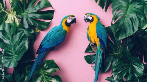 © hazia, Fototapeta premium Two blue-and-gold macaws facing each other amidst lush tropical leaves on a pink background.