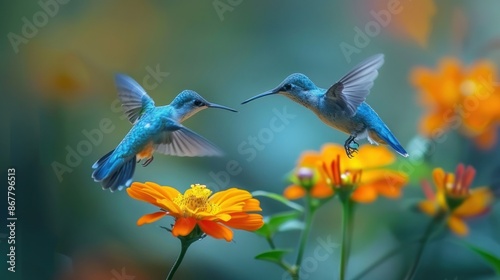 © ROY, Fototapeta premium Two Blue Hummingbirds Hovering Over Orange Flowers