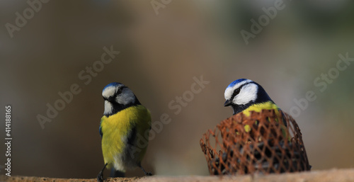 Fototapeta premium Two blue titmice gathered near the feeder...