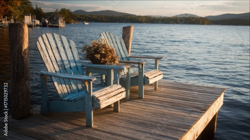 Fototapeta premium Two blue wooden chairs sit on a lakeside dock holding a flower pot. The sun...