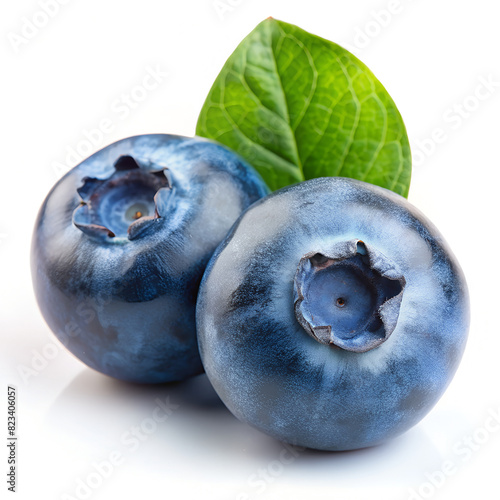 © Chaka_32, Obraz premium Two Blueberries With a Green Leaf