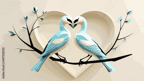 © Flyura Shakembekova, Obraz premium Two bluebirds forming a heart shape with their bodies, perched on a branch against a light background