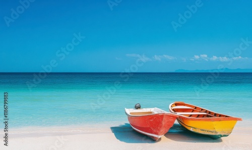 Naklejka premium Two Boats on a Pristine Beach: Two brightly colored wooden boats sit...