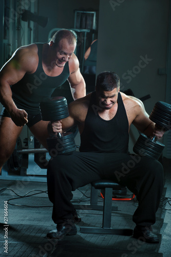 Obraz premium Two bodybuilders training in gym