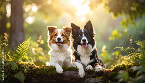 © Eos, Fototapeta premium Two Border Collies Sitting on a Mossy Log in a Forest with Golden Sunlight