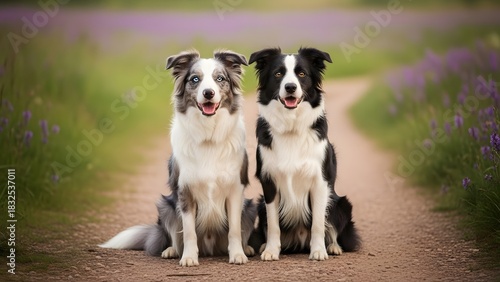 © Jho art, Fototapeta premium Two border collies sitting on a path in a lavender field