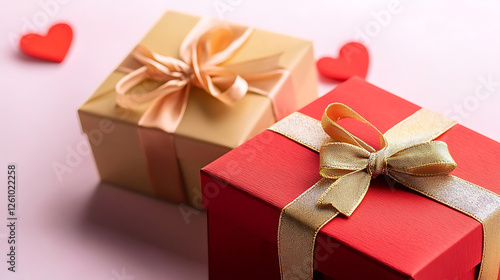 Fototapeta premium Two boxes with bows on them, one is red and the other is brown. generated...