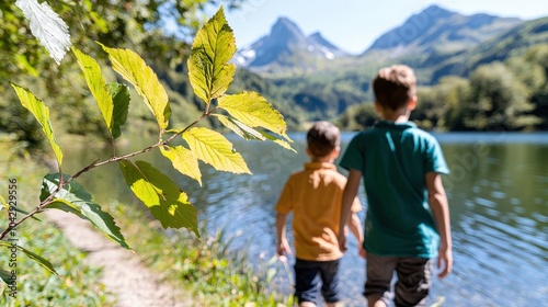 © Narongsag, Fototapeta premium Two Boys Hiking by a Lake with Mountain Views in Summer