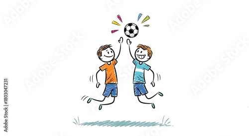 Obraz premium Two boys jumping to hit a soccer ball illustration.